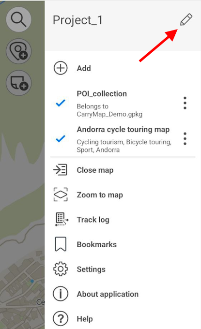 The project name can be changed in the map menu, to do so, tap the editing icon. Enter the new name and tap Enter .
