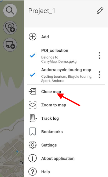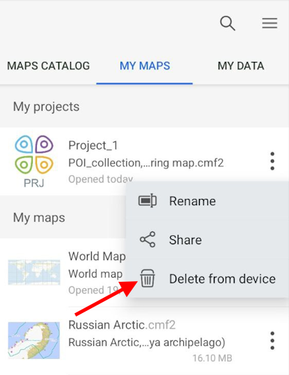 To open the project stored on your device, go to the Map catalog by tapping Close map button in the Main menu.
