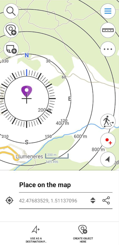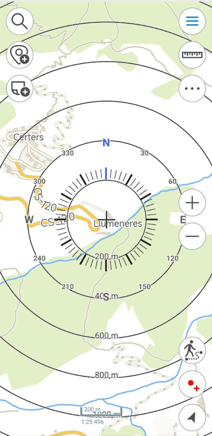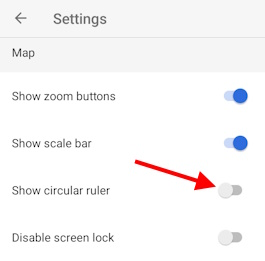 To enable display of the circular ruler on the map, go to Application settings and pull the switch in the Show circular ruler section.