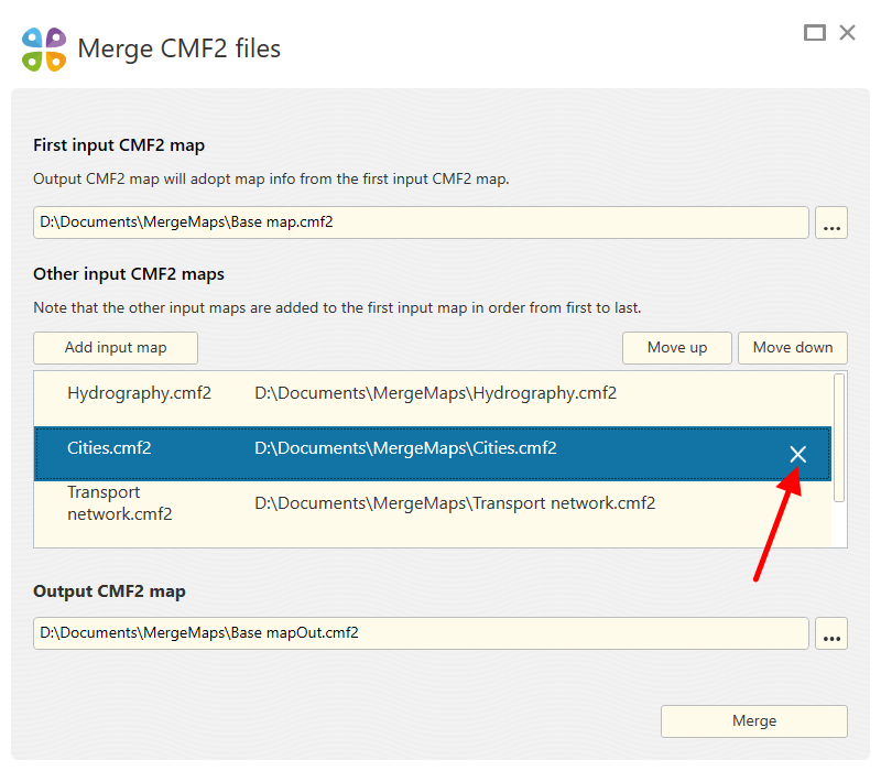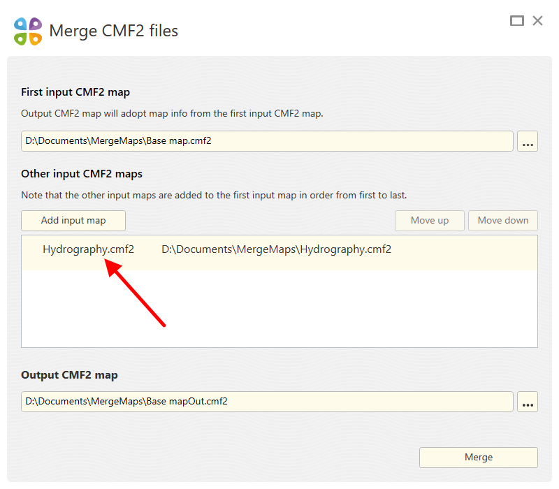If you have multiple CMF2 maps covering the same area, they can be merged to one map for your convenience. To do so, run Merge CMF2 files tool on CarryMap Builder tab.