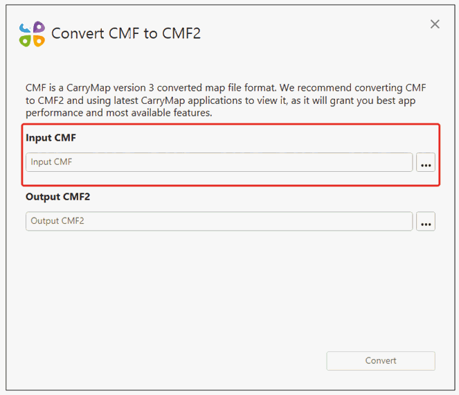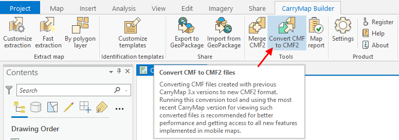 CarryMap Builder is the new generation of ArcGIS Desktop extension with enhanced functionality that replaced CarryMap 3.x. CarryMap Builder creates mobile maps in the new CMF2 format, though users having maps in the old CMF format created using the previous extension generation CarryMap 3.x, can convert them to the new format. For such conversion the CarryMap Builder Convert CMF to CMF2 files tool is used.