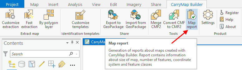 To get report about the map, press Map report button on the CarryMap Builder tab.