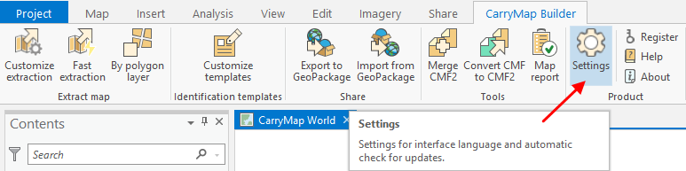 You can change language settings for CarryMap Builder interface, as well as check for availability of recently released CarryMap Builder updates. To do so, press Setting on the CarryMap Builder tab.