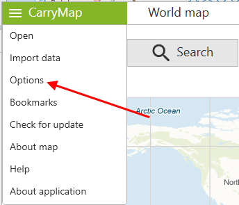 You can access the application Settings from the menu on the start page of the application or from the main menu in the map window.