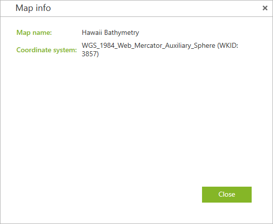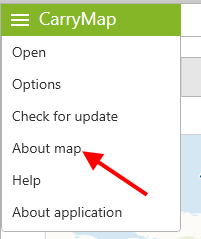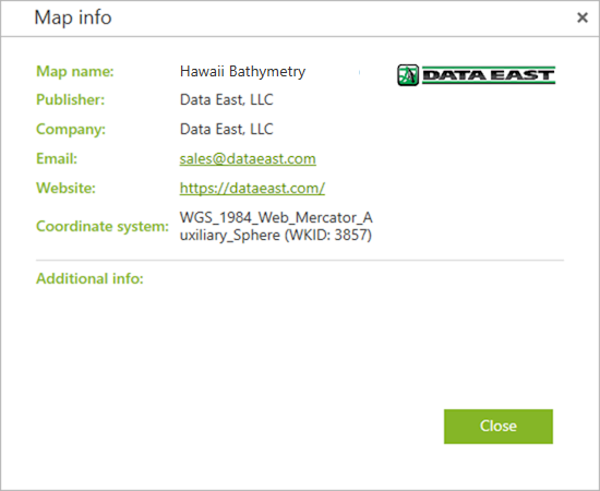 The window showing information about the map specified during its creation using CarryMap Builder extension will appear: map name, publisher, company, email, website, coordinate system, logo, additional info.