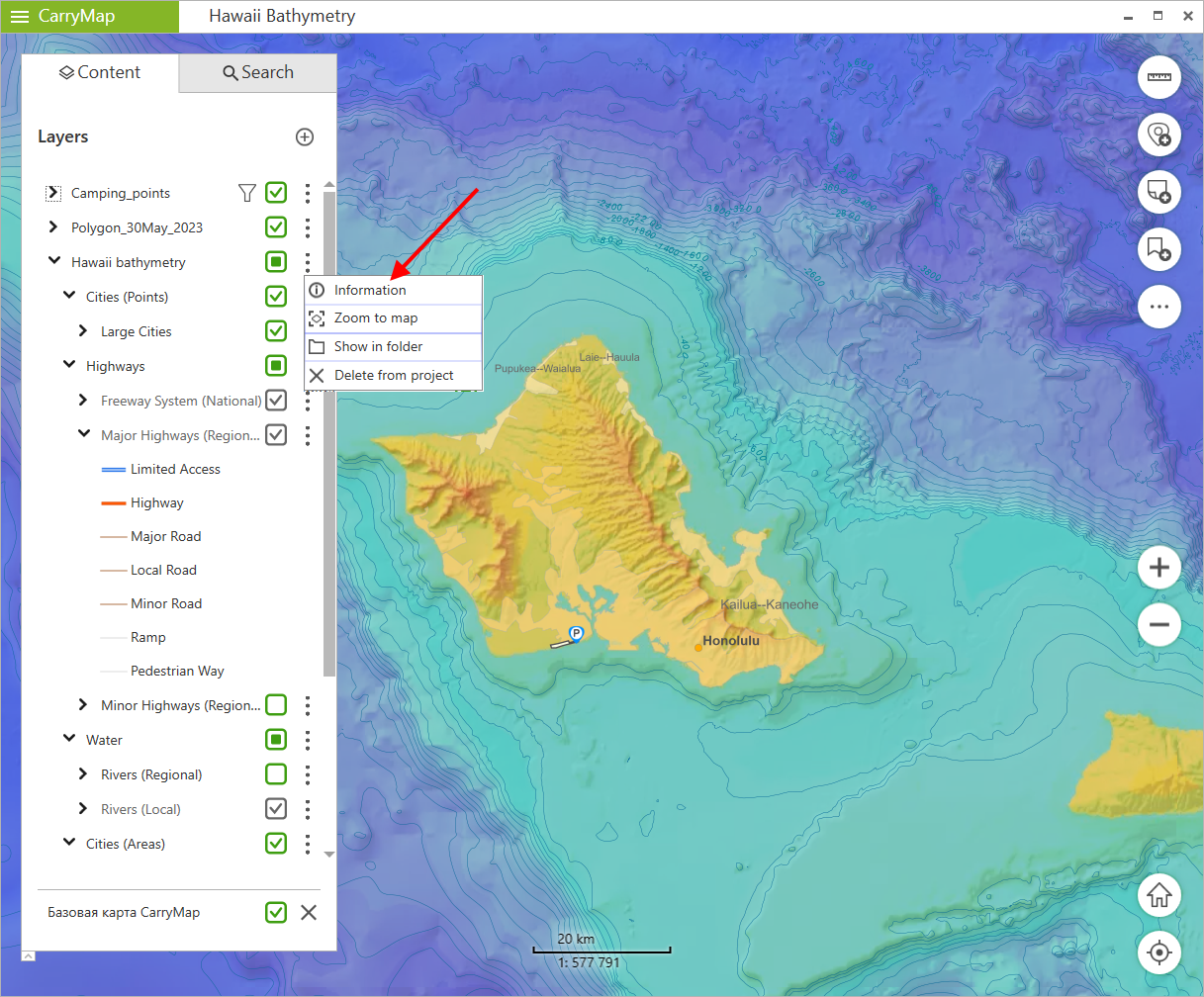 To view information about the CMF2 map, press the three dots icon near the map name on the Content tab and select Information.